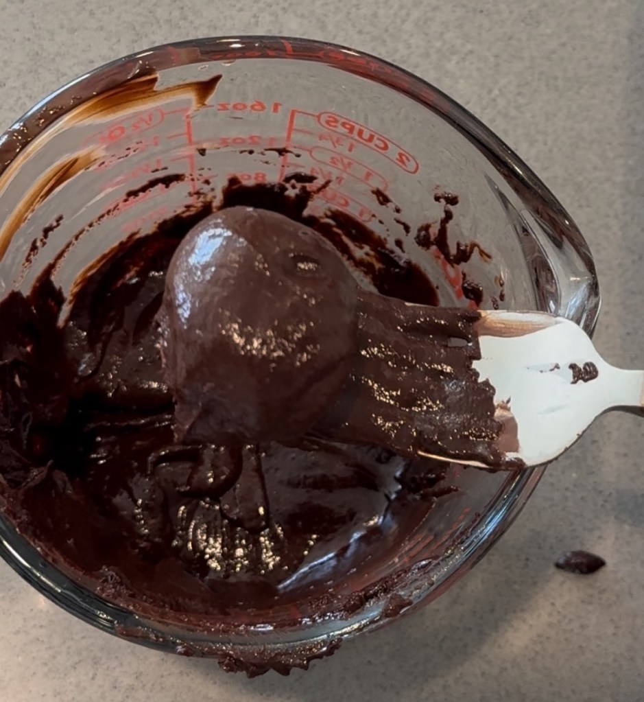 Melt down dark chocolate. Either on the stove or in the microwave at 30 second intervals (stirring in between). I had to add a little coconut oil because my dark chocolate was a little thick on its own, this is optional. Looking back, I was using a healthier chocolate chip. It did not have any added oils or sugar and I believe this is why my chocolate didn’t melt down as thin.