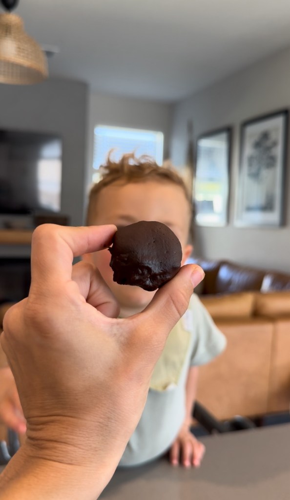 After the dough balls have cooled in the refrigerator, using a fork dip them into the melted dark chocolate. Covering the entire ball with chocolate on all sides. Let excess chocolate drip off and set back on parchment paper lined baking sheet. Fully allowing excess chocolate to drip off prevents the truffles from having bottoms or look like a “hat”. Once all balls are covered in chocolate return to parchment paper covered baking sheet and put in the fridge for about 2 hours.