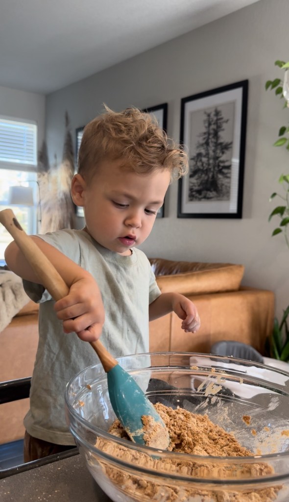 Baking with a toddler is equal parts joyful and messy, turning a simple recipe into a delightful adventure. Little hands eager to pour, stir, and sneak tastes make the kitchen come alive with laughter and curiosity. Measuring ingredients becomes a mini math lesson, it is practice with dexterity and a sensory activity like no other. While flour might end up on the floor as much as in the bowl, these spills and smudges create memories just as sweet as the treats themselves. I am always so amazed what little humans can do with practice and a little patience. Baking with a toddler may take a bit longer, but it’s filled with so many amazing moments.