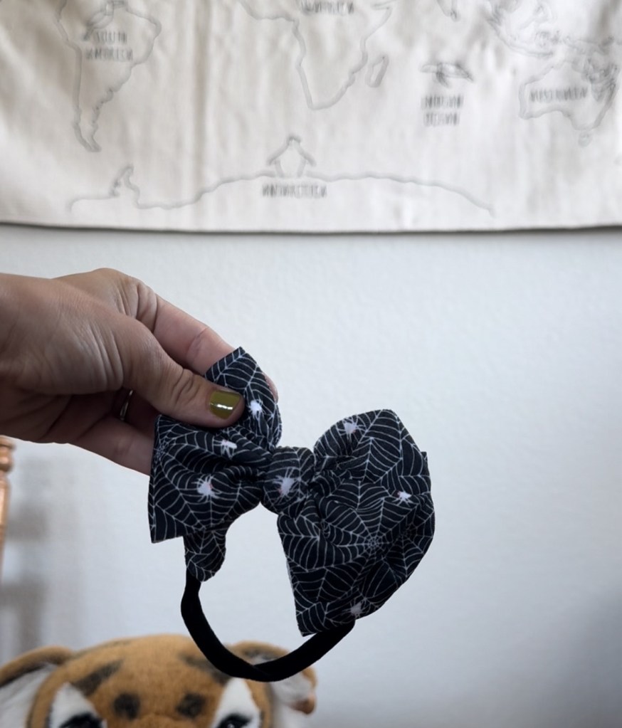 Finishing everything off with a bow that has spiderwebs on it. If I was creating a boy version of this, I would add a black beanie with some glued on googly eyes, but I wanted to make it cutesy for my little girl.
