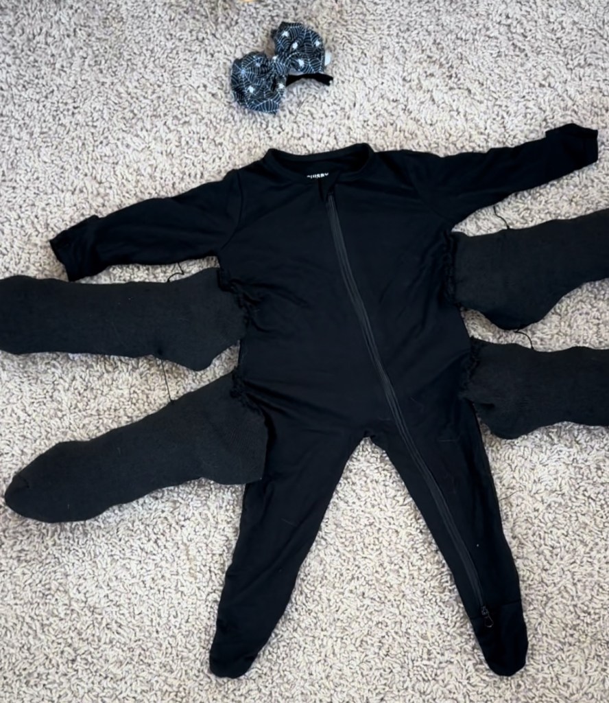 Really I just used a black long sleeve onesie, black embroidery thread, a needle, black socks, and some newspaper plus a bow with spiderwebs on it.