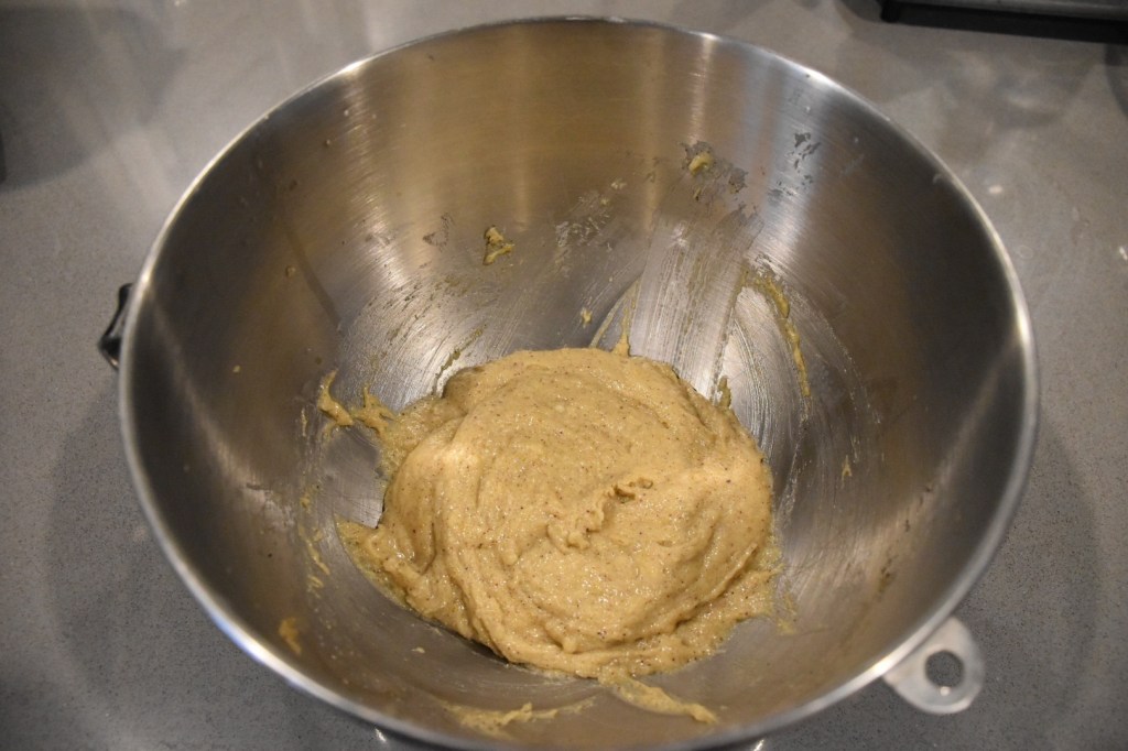- Cream butter & sugars: In a separate large mixing bowl, whisk together melted butter, brown sugar, and granulated sugar until combined and slightly creamy. Whisk for about 1 min, sugars should turn a slightly lighter color.