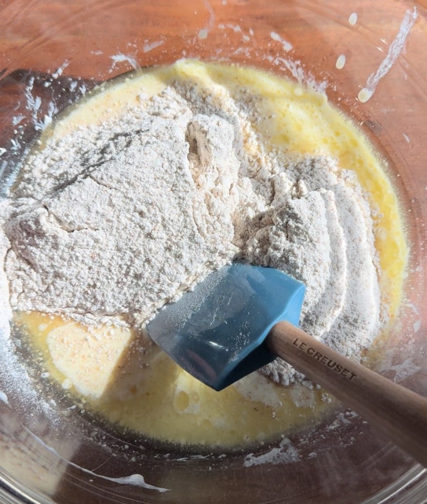 - Stir the wet ingredients into the dry, then fold in spinach and cheese.