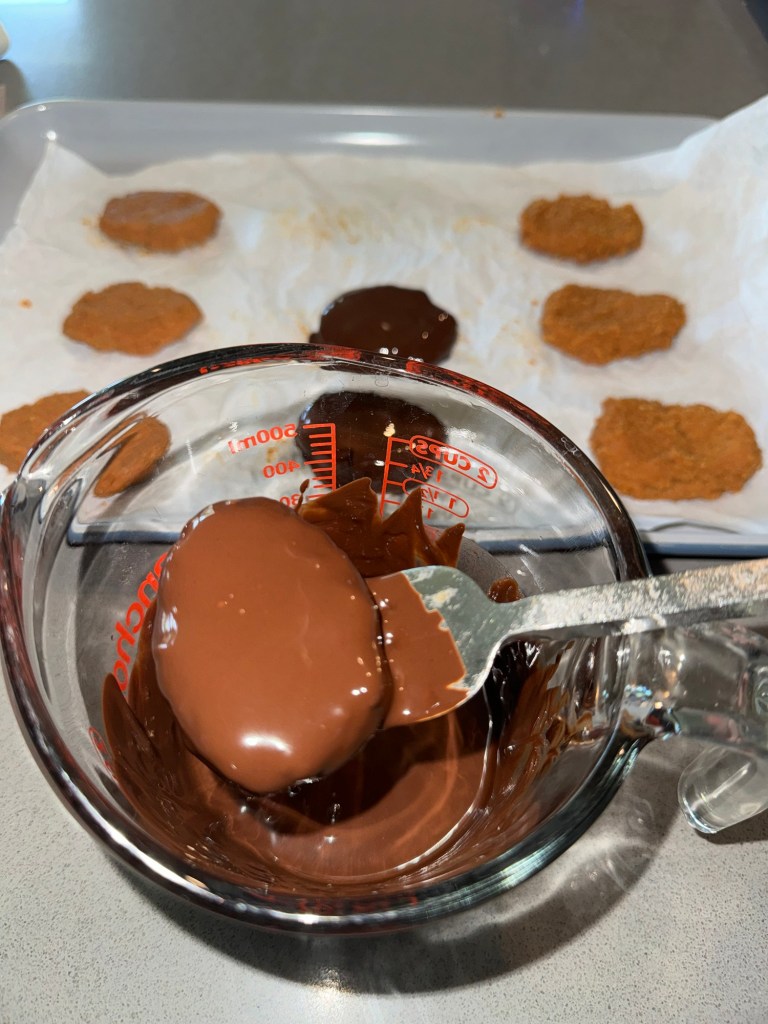 After the dough eggs have cooled in the refrigerator, use a fork to dip them into the melted dark chocolate. Once all eggs are covered in chocolate return to the fridge for about 2 hours.