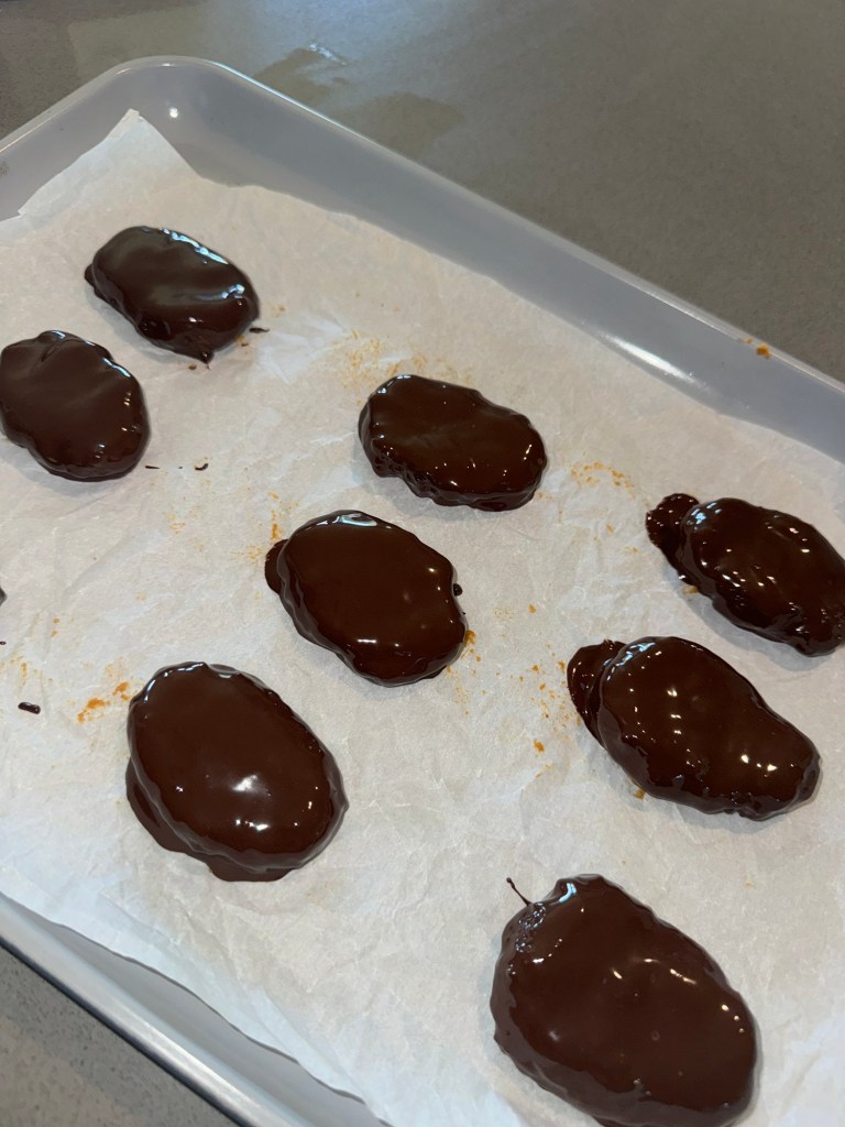 After the egg shaped dough has cooled in the refrigerator, use a fork dip them into the melted dark chocolate. Covering the entire egg with chocolate on all sides. Let excess chocolate drip off and set back on parchment paper lined baking sheet. Fully allowing excess chocolate to drip off prevents the truffles from having bottoms or look like a “hat”. Once all balls are covered in chocolate return to parchment paper covered baking sheet and put in the fridge for about 2 hours.