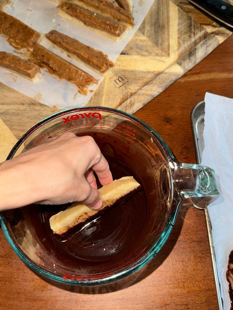 Dip the firmed caramel-topped shortbread bars into the chocolate to coat the top, letting any excess drip off. I did it both ways with coating the entire bar in chocolate and then did some that just coated the top date layer, so whichever you would like.