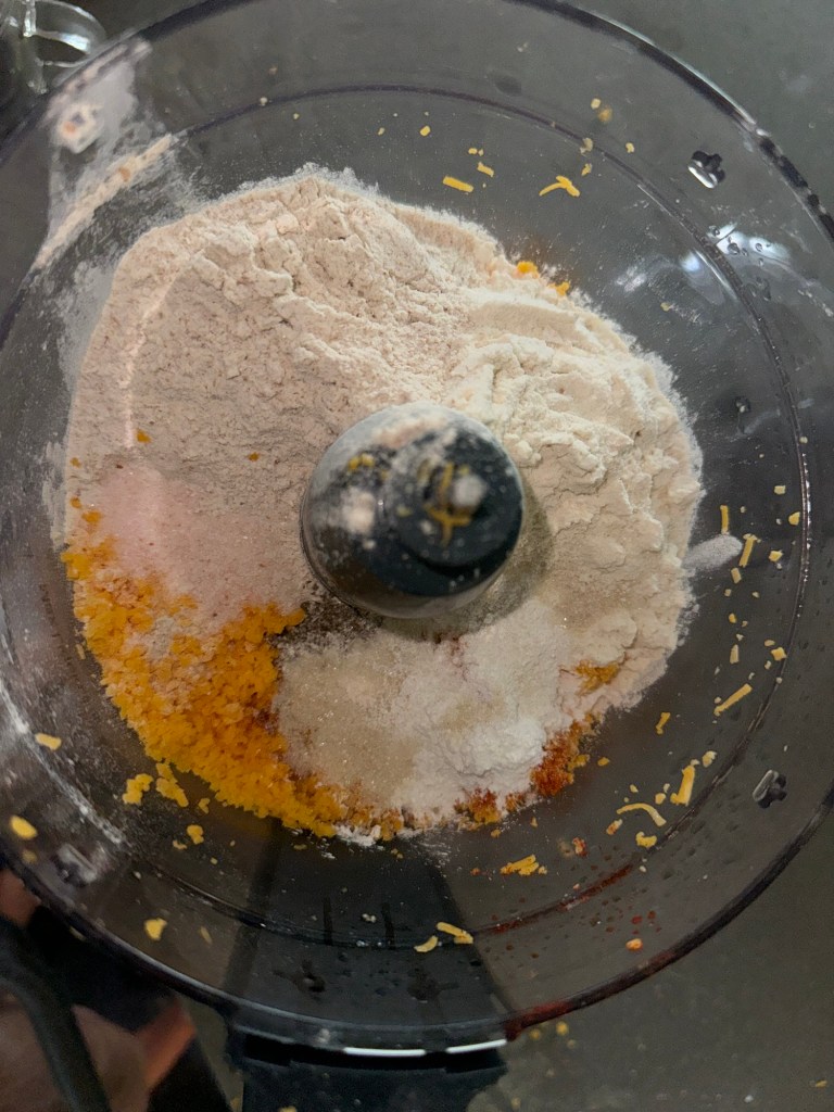 Add the shredded cheese to a Food Processor and pulse a few times to break it down even further. Then, add the flour, salt, baking powder and any spices you’d like, I’ve listed in the ingredients what we use. Pulse until the mixture looks evenly combined.