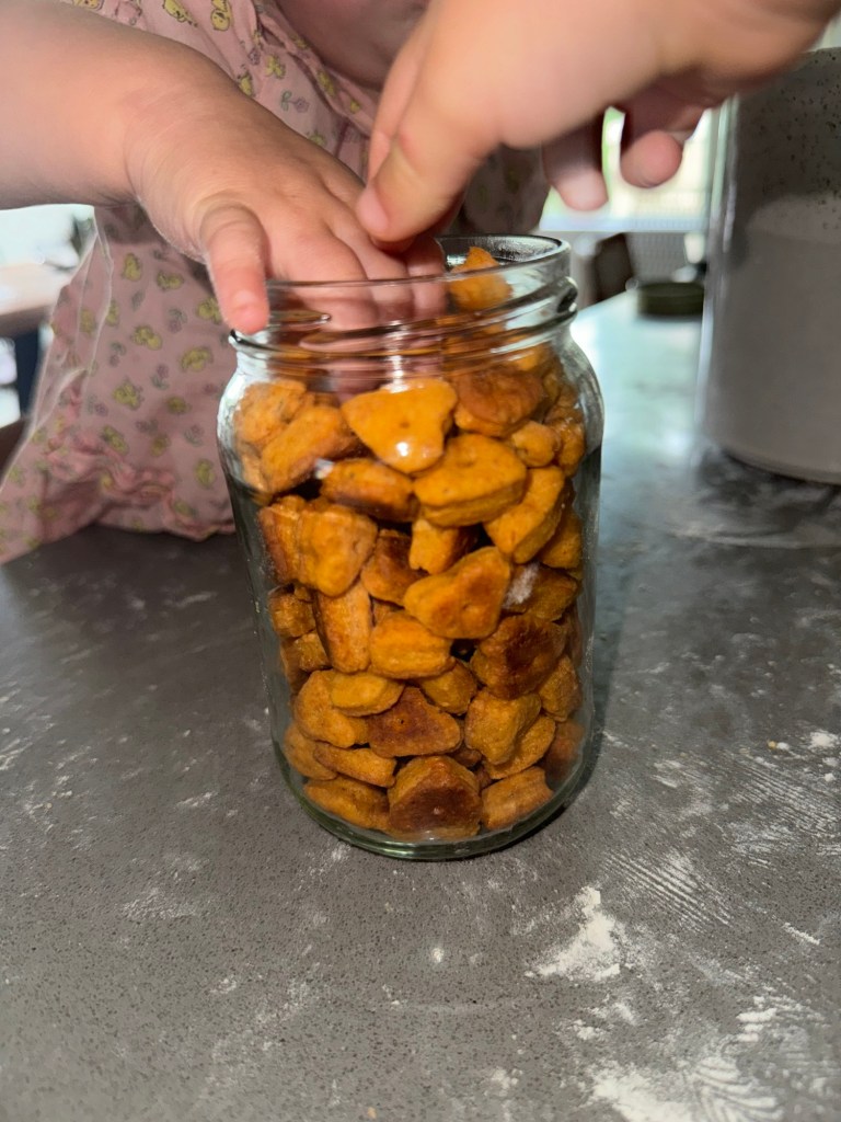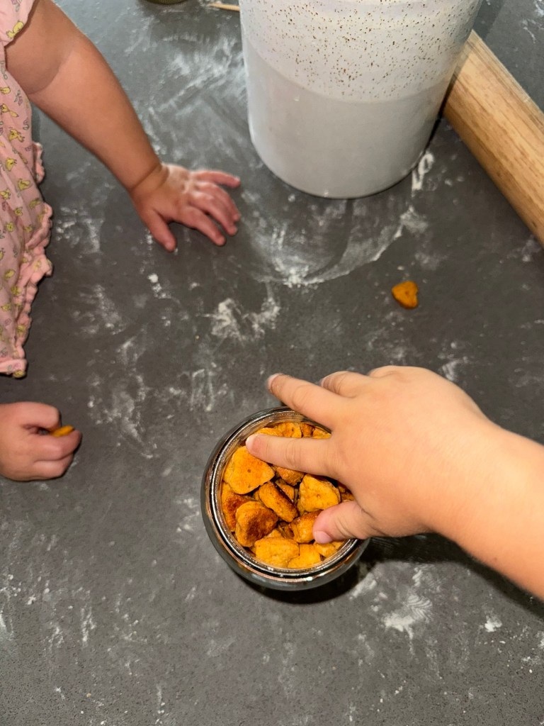 On a lightly floured surface, roll the dough out to about ⅛-inch thickness—thin enough to crisp, but thick enough to hold together in little toddler hands. Use a small cookie cutter (I used this Mini heart shaped cookie cutter) or just slice into bite-sized squares with a knife or pastry cutter. These crackers definitely give a gold fish vibe so you can use this cutter as well. Re-roll any scraps and keep cutting until all the dough is used.
