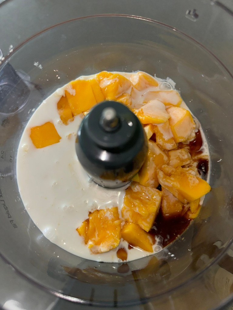- Add mango, coconut milk, honey, and vanilla to a blender or food processor.