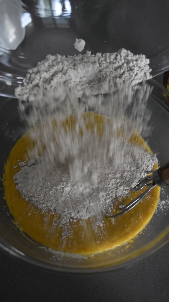 - In a separate bowl, mix flour, cinnamon, pumpkin spice, baking soda, nutmeg and salt.