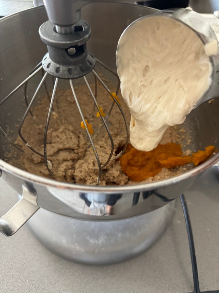 - Mix in pumpkin purée and sourdough discard until smooth.