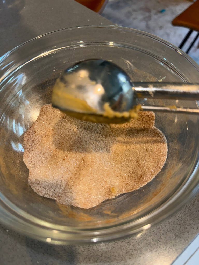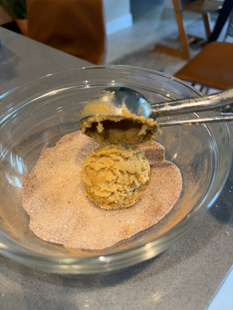 - Preheat oven to 350°F (175°C). Scoop dough (about 3 tbsp each) and roll into cinnamon sugar coating. Place onto a parchment-lined baking sheet and press slightly with fingers.