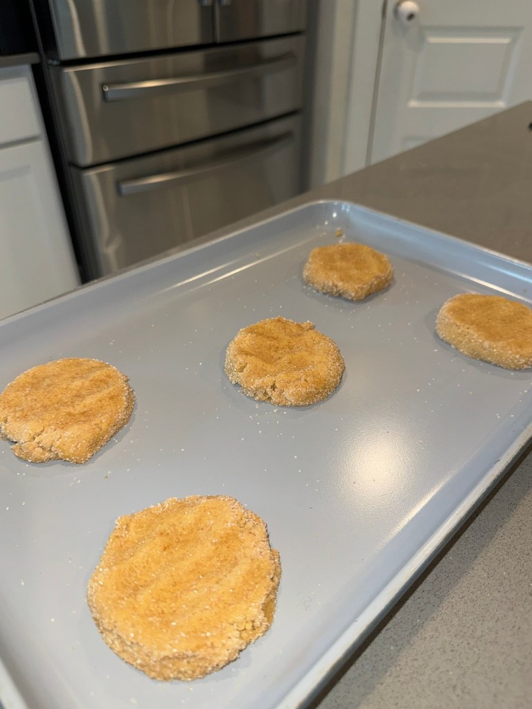 Scoop the dough into about 3 tablespoon sized balls, and roll into your sugar coating mixture. Space them a couple inches apart on your cookie sheet. I use this 3 tbsp cookie scoop, now keep in mind that these make pretty big cookies. Feel free to use a smaller cookie scoop, just adjust your cooking time. I will then flatten out the cookies just a little with my fingers.
