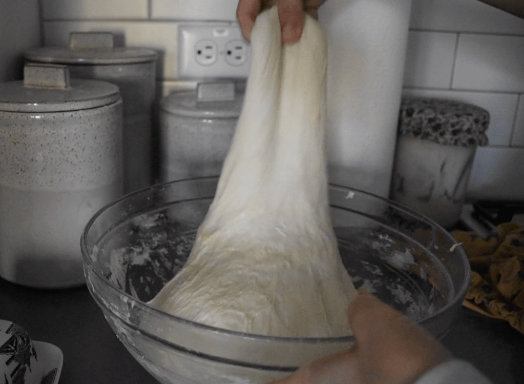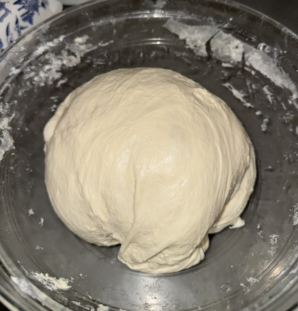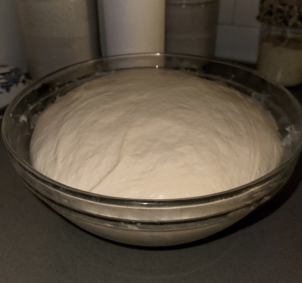 Perform 4–5 stretch-and-folds: Grab one side of the dough, stretch upward, and fold over itself. Rotate the bowl and repeat. You will do this on all four sides of the dough. Repeat this every 30 minutes until the dough feels: Smooth, elastic, less sticky and slightly shiny. For me about 4 does the trick but you may need 5 to get the desired feel.