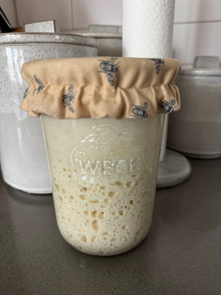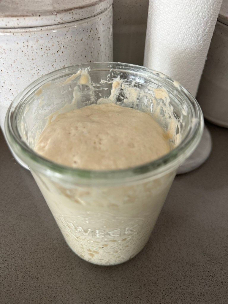 Let sit for 3–4 hours, or until it reaches peak rise. At peak, the starter looks domed on top and full of bubbles. It should have at least doubled. This is the timing for me in the south, depending on where you are (temps play a big role) it can take up to 12 hours to reach peak. So adjust your bakers schedule accordingly.