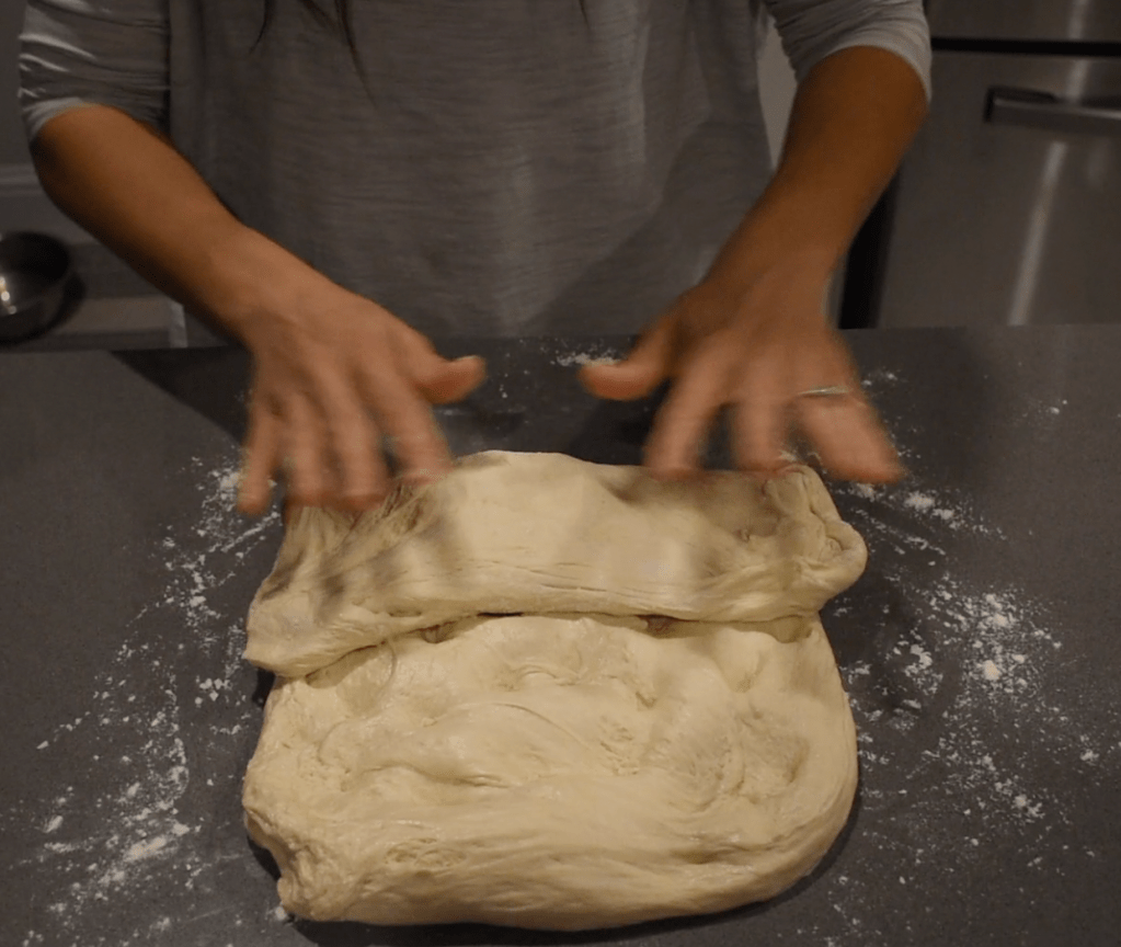 Lightly flour your work surface and turn out the dough. Gently press into a rectangle and dimple the surface (like focaccia). Fold the dough into thirds. Roll from one side to create your dough ball.