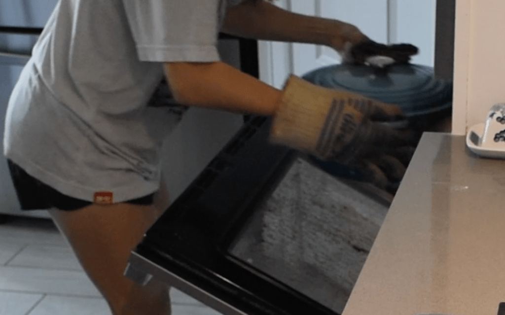 Helpful hint: Place an empty sheet pan on the rack below the Dutch oven to prevent the bottom from burning. Another option is to put died rice in your Dutch over and place the parchment paper and dough on top of the rice. This again helps with burning because the rice will burn before the bottom of your bread will.